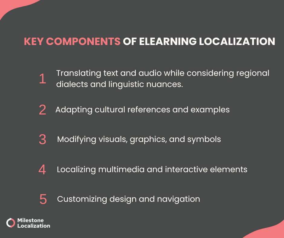 Videos, animations, and interactive components are customized to meet regional preferences. For example, changing text direction for right-to-left languages like Arabic or incorporating local musical styles in background audio.